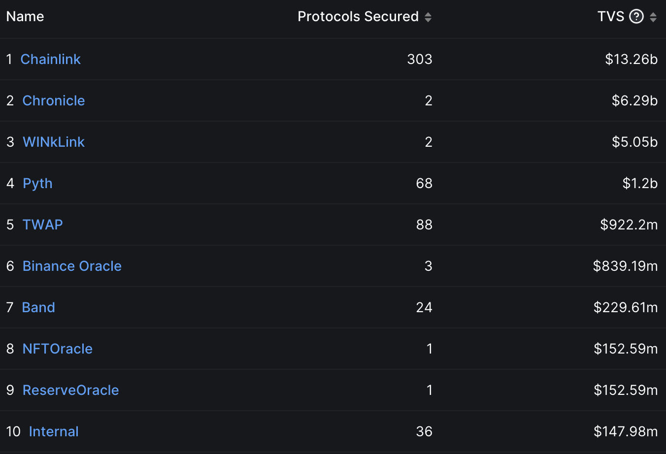 As per DefiLlama, the oracle provider sector secures a total value of $28.8 billion. Chainlink is the largest oracle provider in terms of both total value secured (TVS) and number of protocols served, capturing more than 46% of the TVS market share. Other notable providers include Pyth Network, Band Protocol, DIA, and Uma. It is interesting to note that due to the importance of price oracles to ensure assets are accurately priced, e.g. on lending protocols (to avoid surprise liquidations), these typically rely on more than one oracle provider, resulting in shared market space. However, the space remains a competitive one – of the 44 oracle providers listed on DefiLlama, only five oracle providers have customers in the double digits (from the images above, “TWAP” and “Internal” refer to a method of oracle pricing as opposed to an actual oracle provider).
