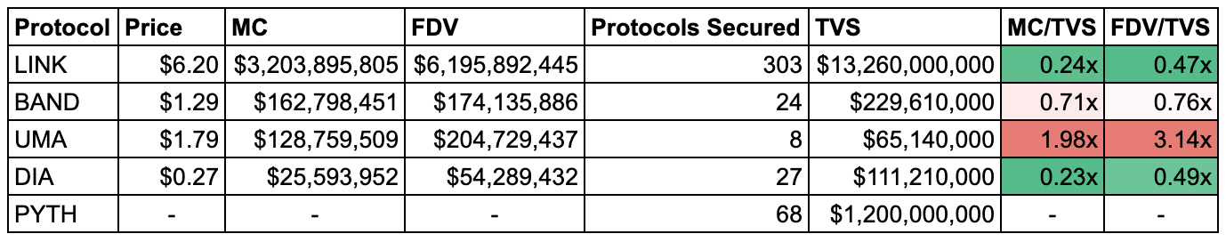 Chainlink (LINK), the leading player in the space, is priced at $6.20 and has a market cap of roughly $3.2 billion and a fully diluted valuation (FDV) of $6.2 billion. It secures 303 protocols with a total value secured (TVS) of $13.26 billion. This gives LINK a MC/TVS ratio of 0.24x and a FDV/TVS ratio of 0.47x, reflecting relatively lower valuation ratios given its secured value.