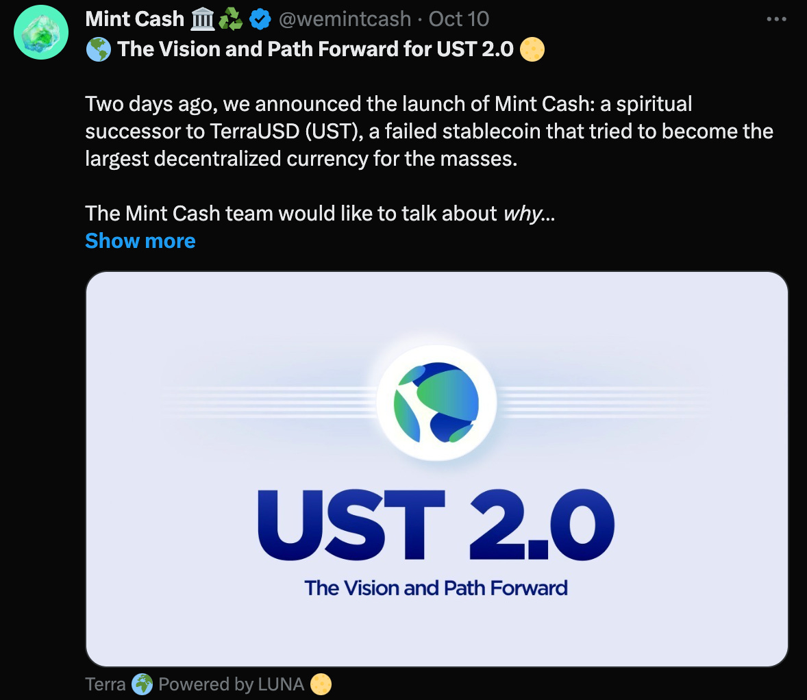 (ii) locking and burning specified amounts of $USTC with Mint Cash’s airdrop contract (TBD) Source