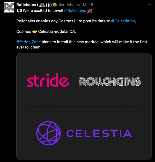Cosmos L1s + Celestia DA = Rollchains