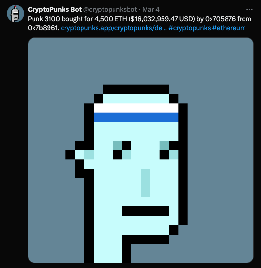 Punk 3100 bought for 4,500 ETH ($16,032,959.47 USD) — cryptopunksbot
