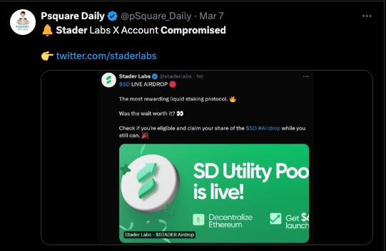 Stader Labs' X account is compromised, do not interact with any tweets